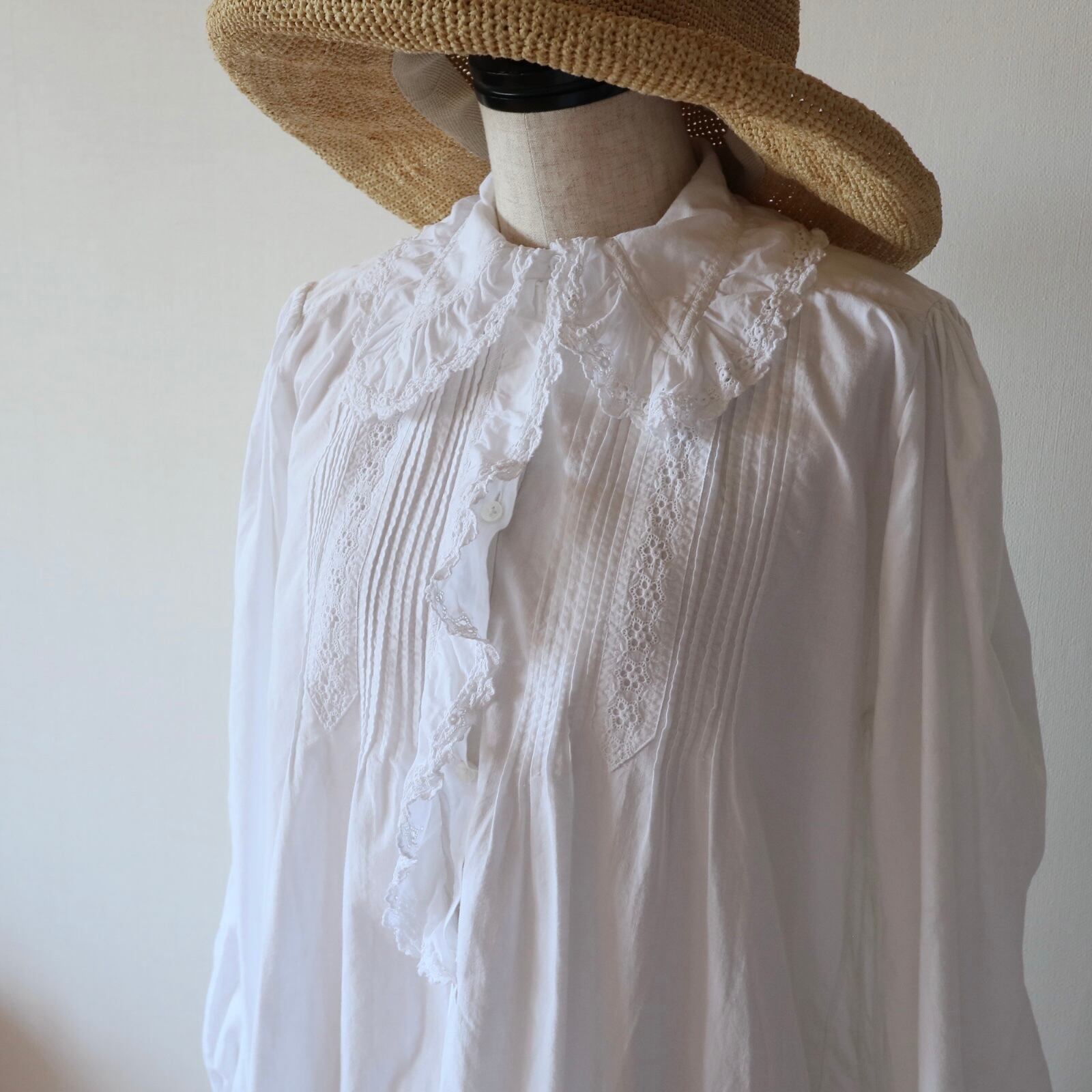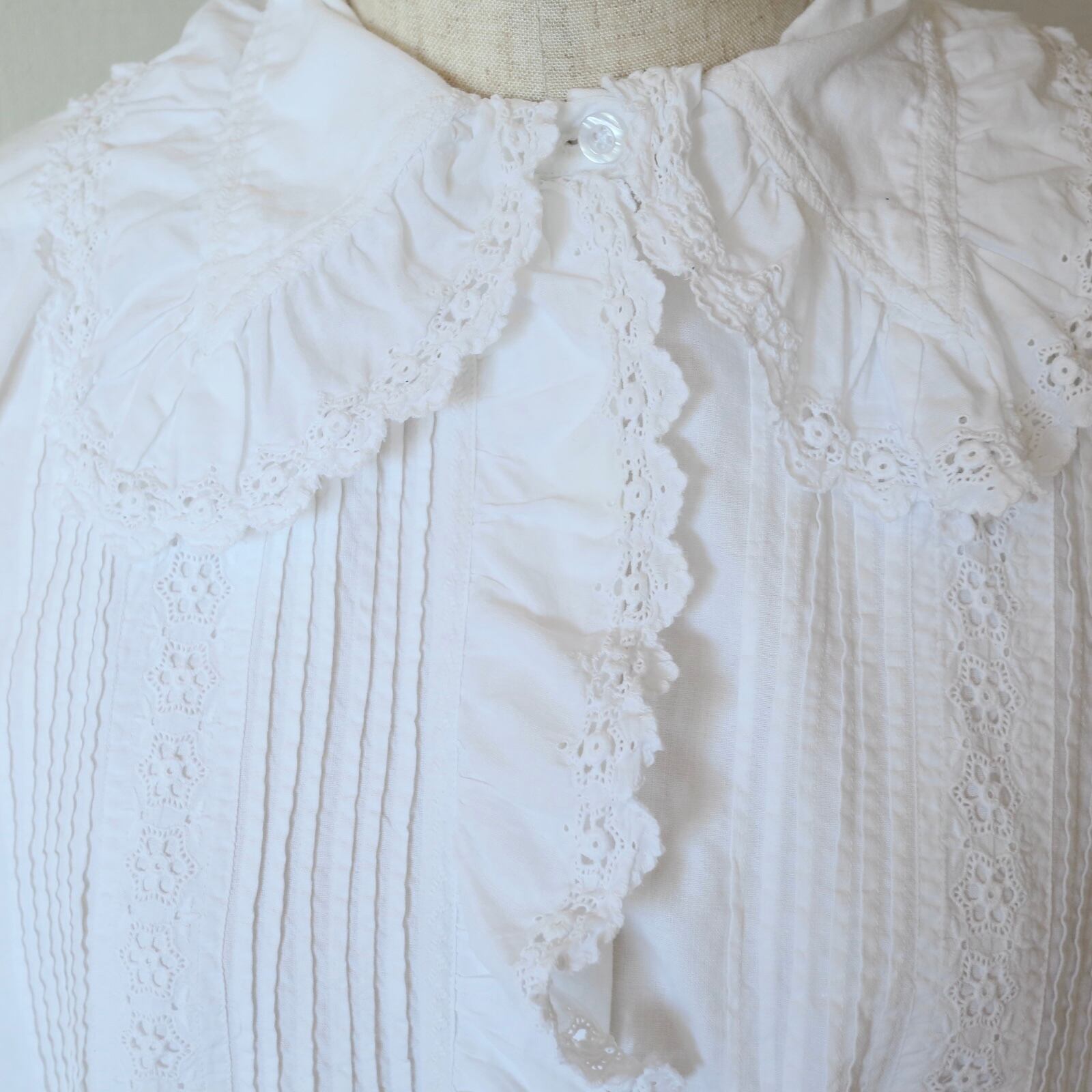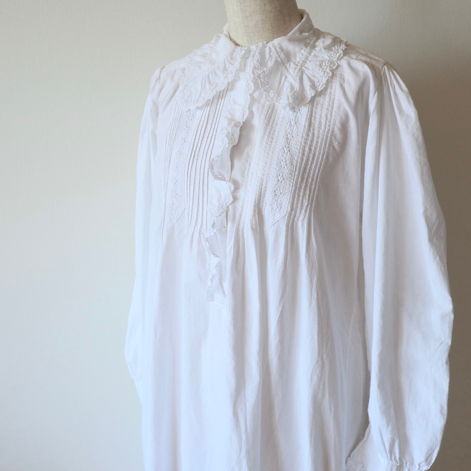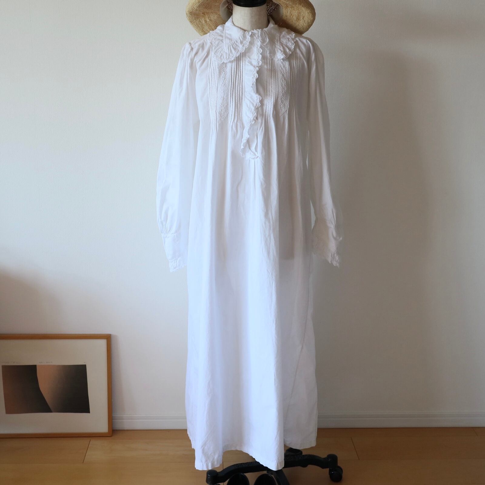 1860~1900年頃のアンティークナイトドレスがイギリスより届きました。大きな襟や前立て、袖口のフリルは美しく生地はしっかり目のcottonです。王道にして一番人気のビッグカラーをお探しの方に是非おススメの1枚です。