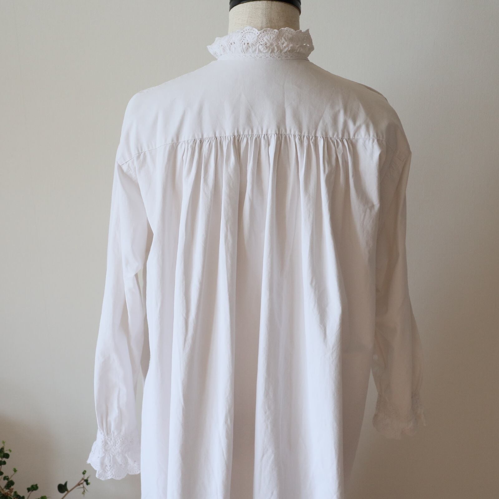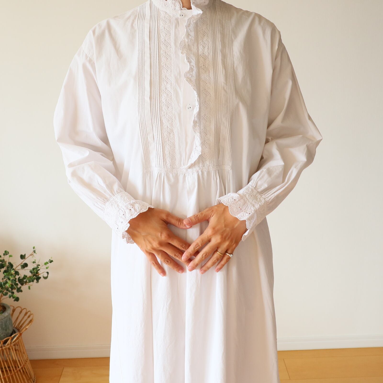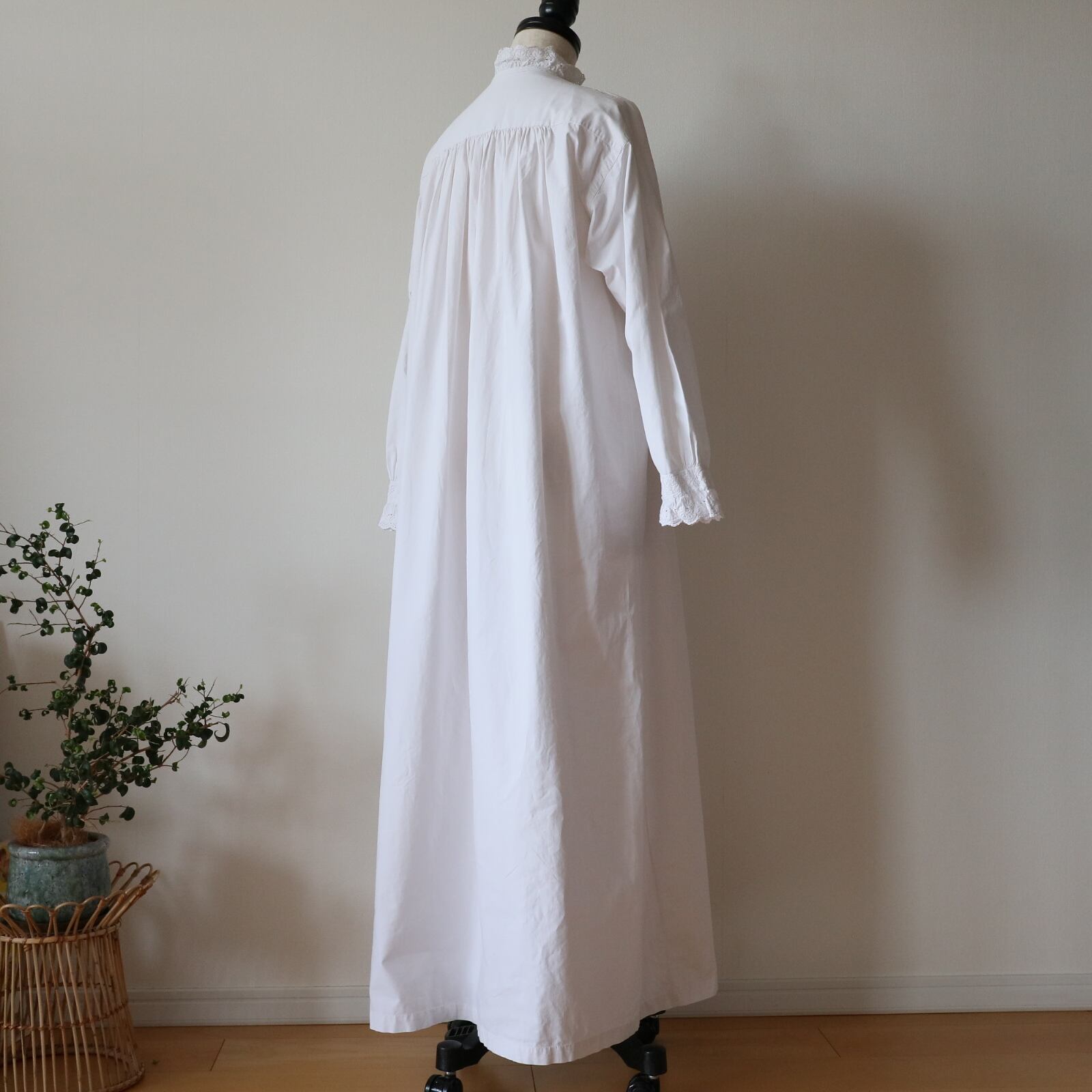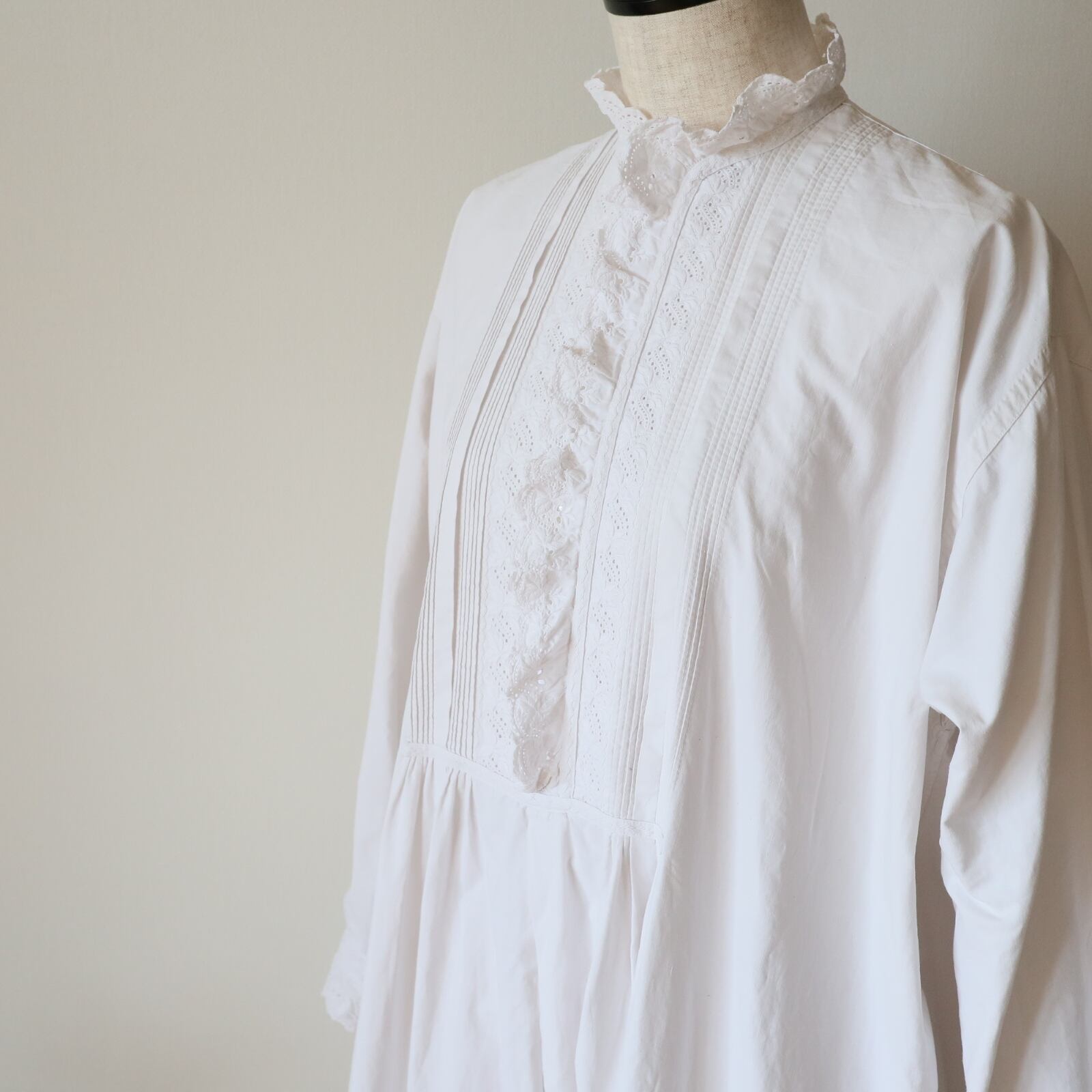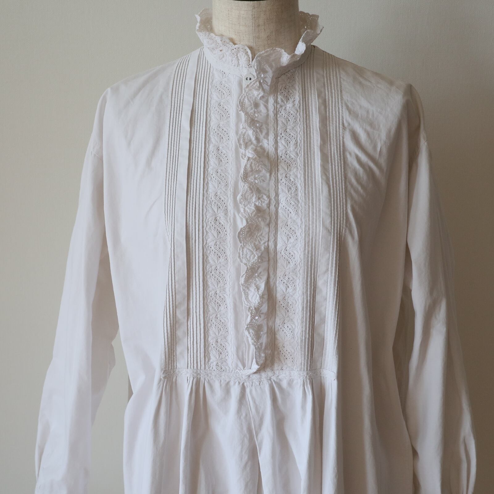 根強い人気を誇るスタンドカラーのアンティークナイトドレスが久々に入荷しました。袖口、そして襟から前立てへと続くフリルには控えめながらも存在感のある美しい刺繍が施されています。また前立ての横の細いピンタックをはじめ、全て手縫い・手刺繍で仕立てられてます。