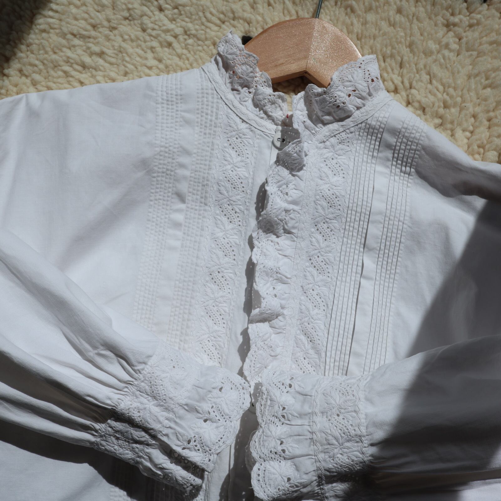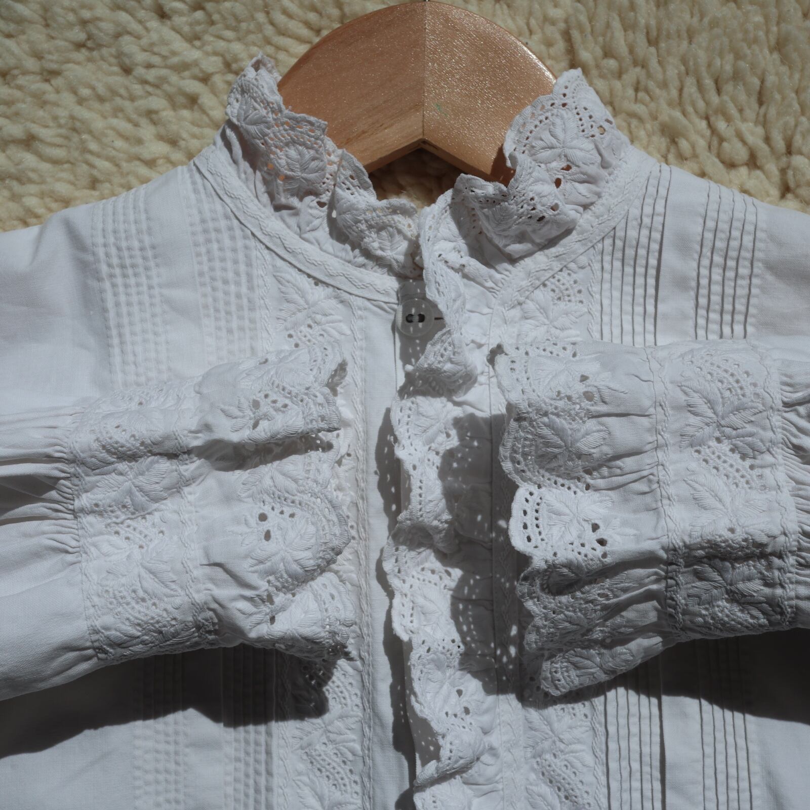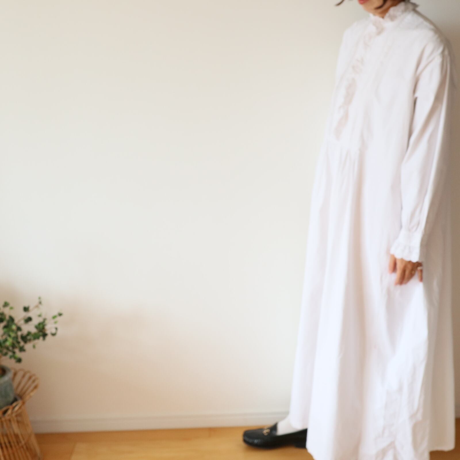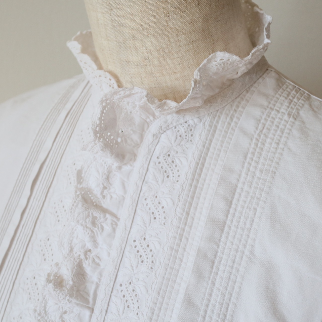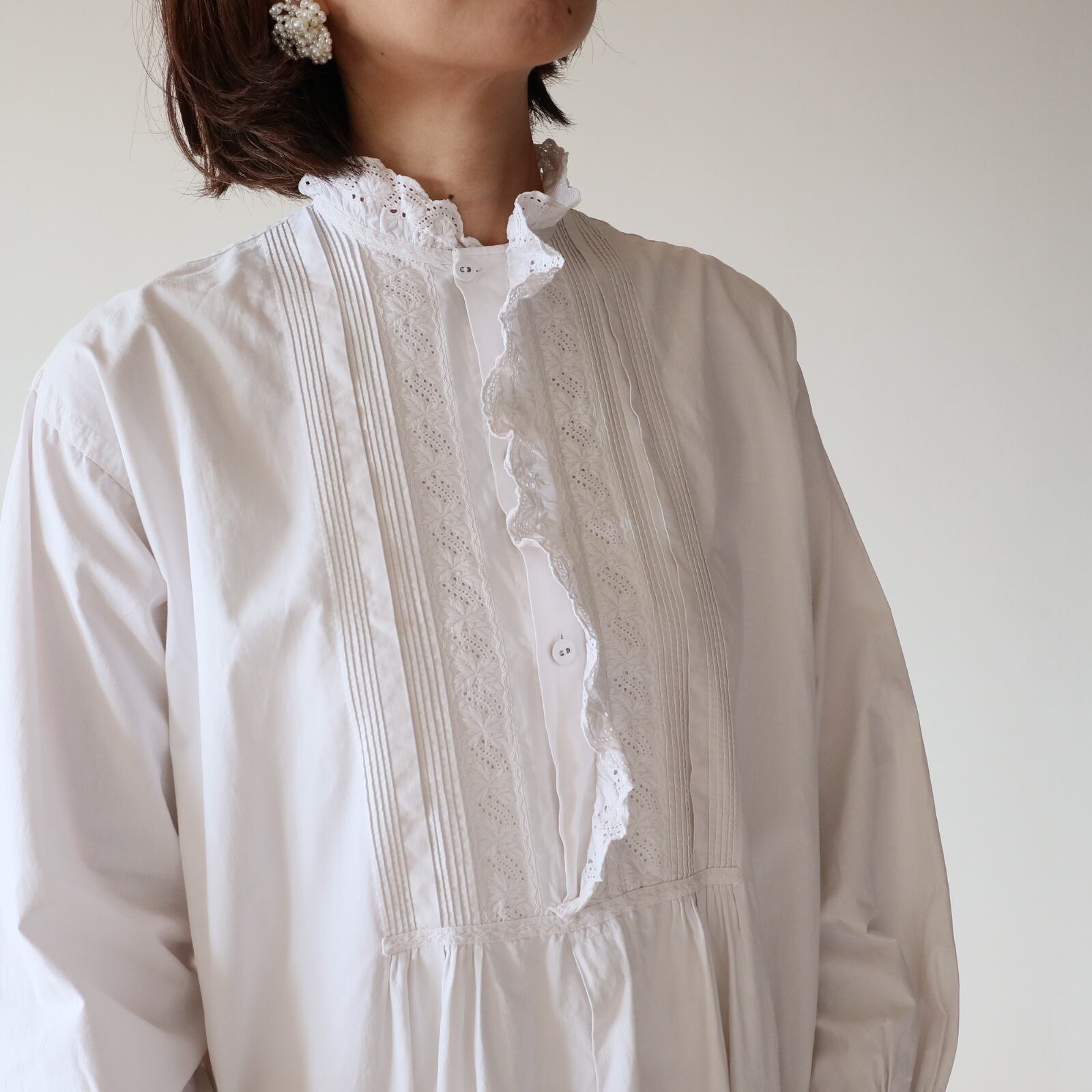 根強い人気を誇るスタンドカラーのアンティークナイトドレスが久々に入荷しました。袖口、そして襟から前立てへと続くフリルには控えめながらも存在感のある美しい刺繍が施されています。また前立ての横の細いピンタックをはじめ、全て手縫い・手刺繍で仕立てられてます。
