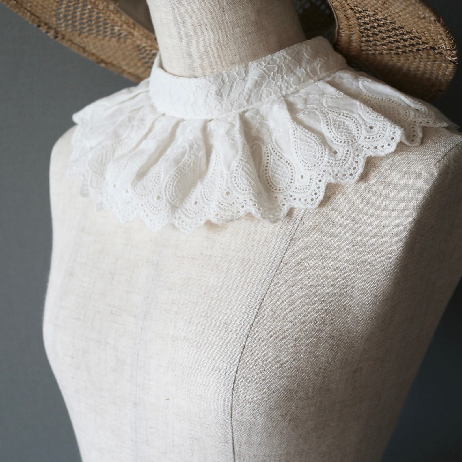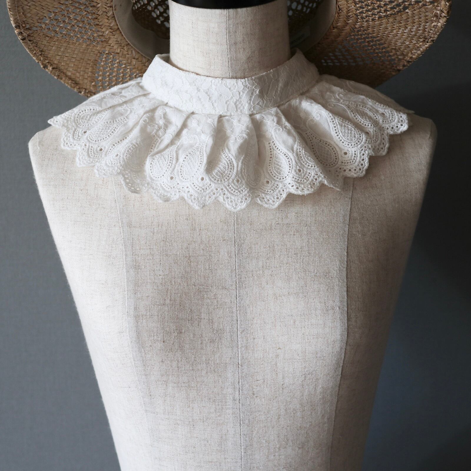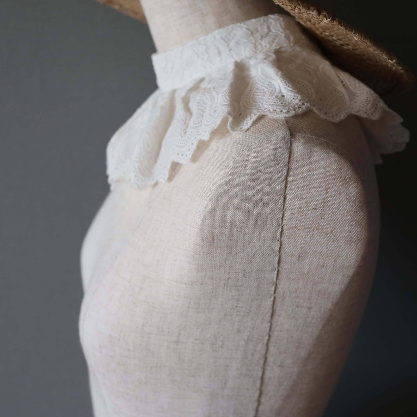 ビンテージレースを使用してハンドメイドで仕上げられたサイズ感がとっても可愛いつけ襟です。首も詰まりすぎておらず程よいゆとりがあり、大きいつけ襟は少し苦手…という方にも是非おススメの1枚です。