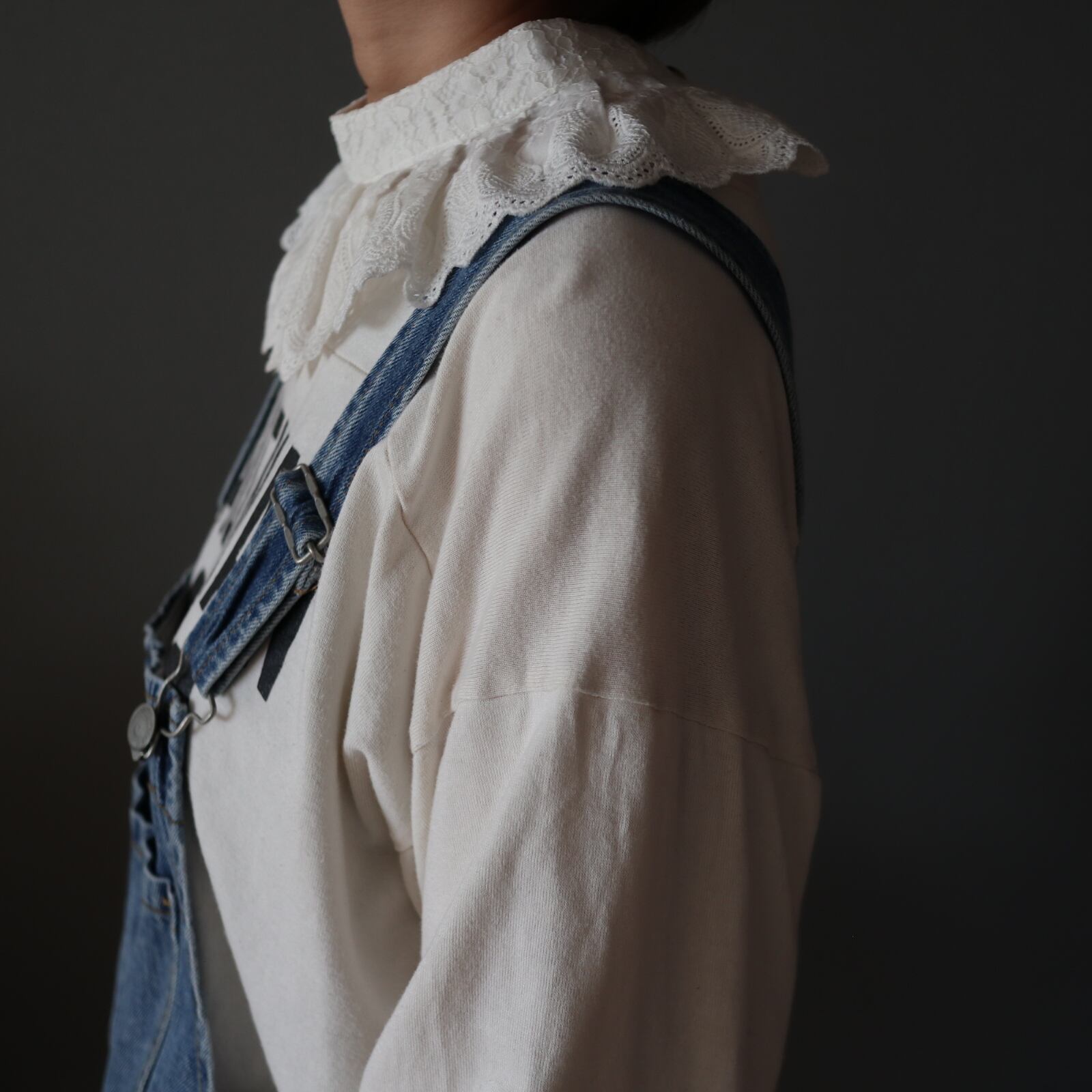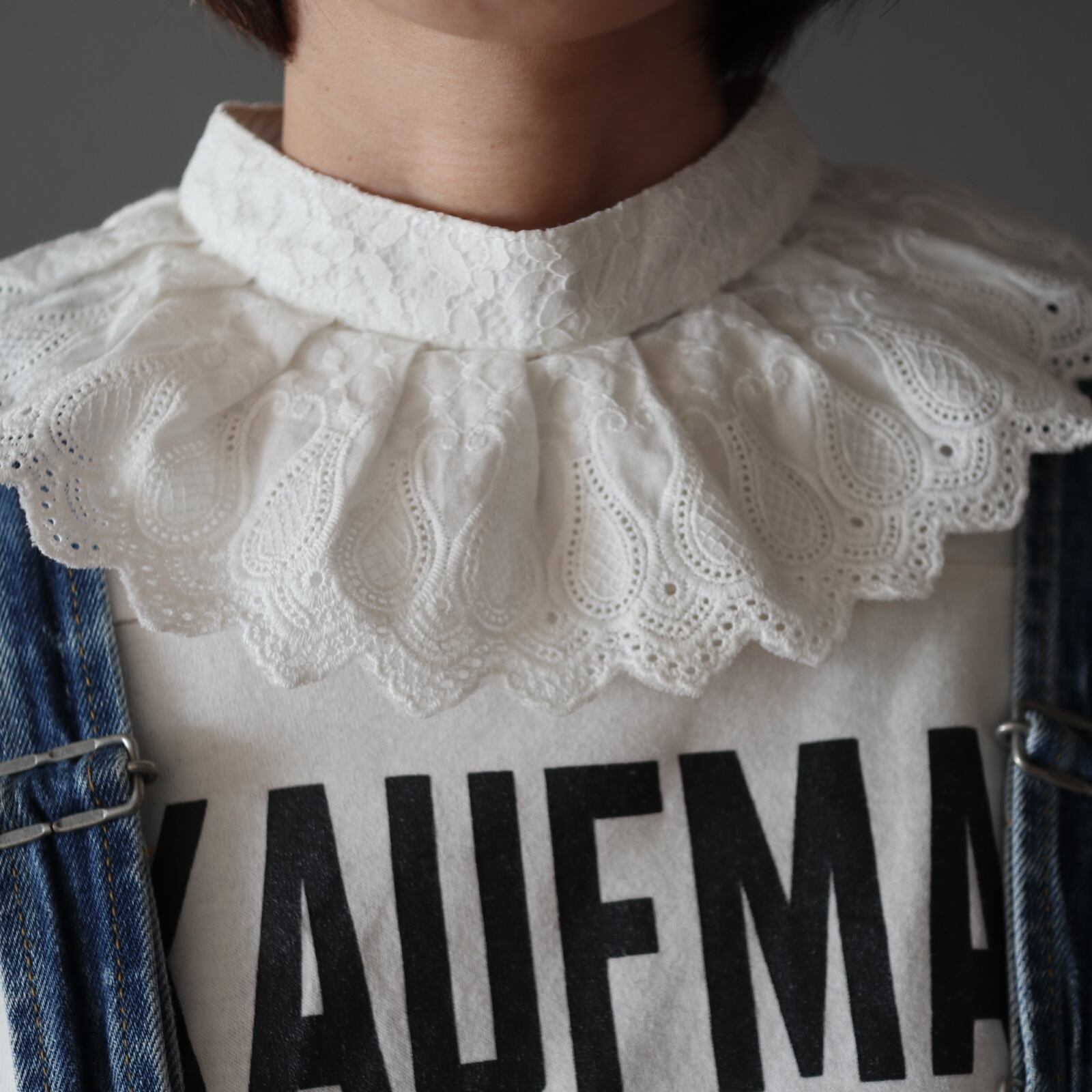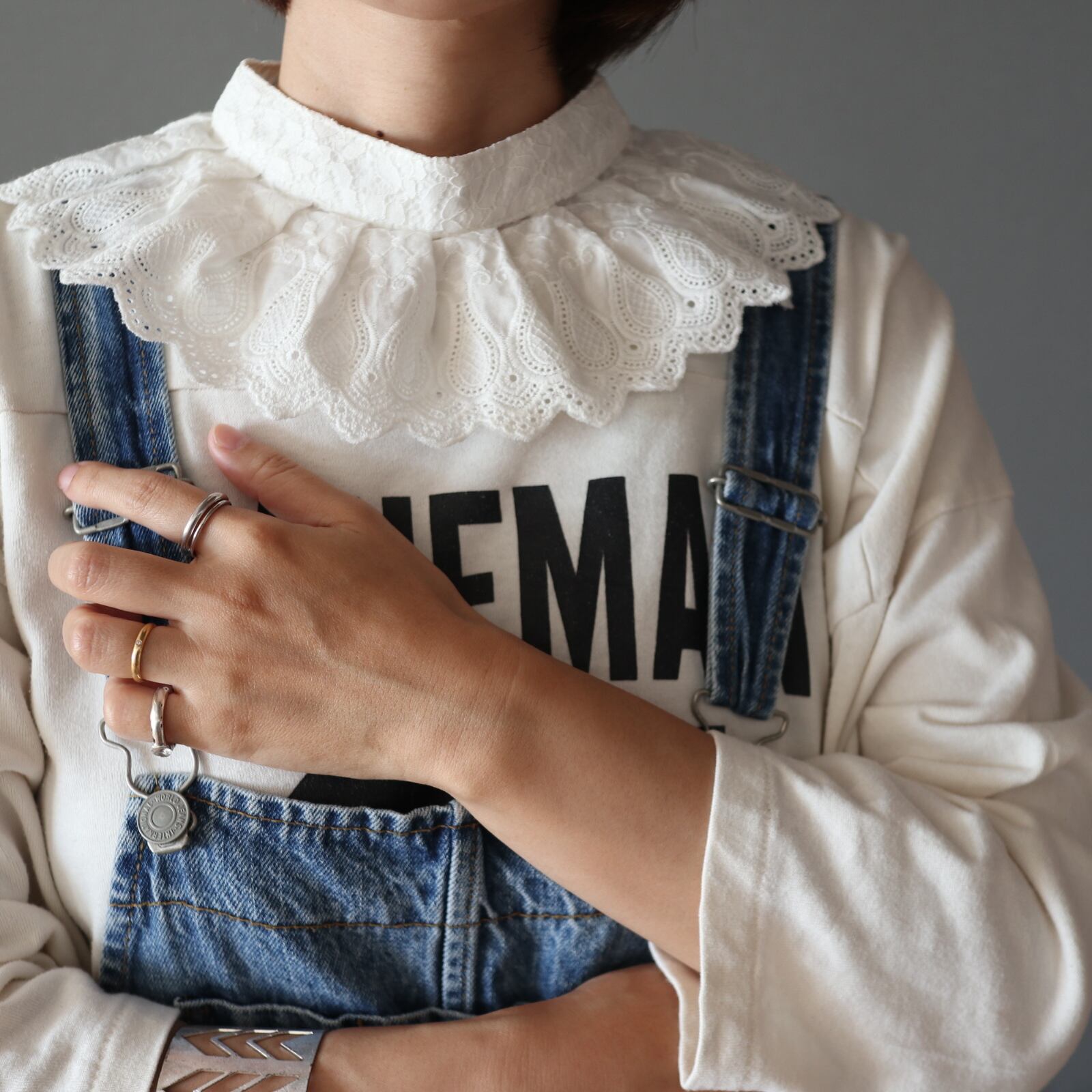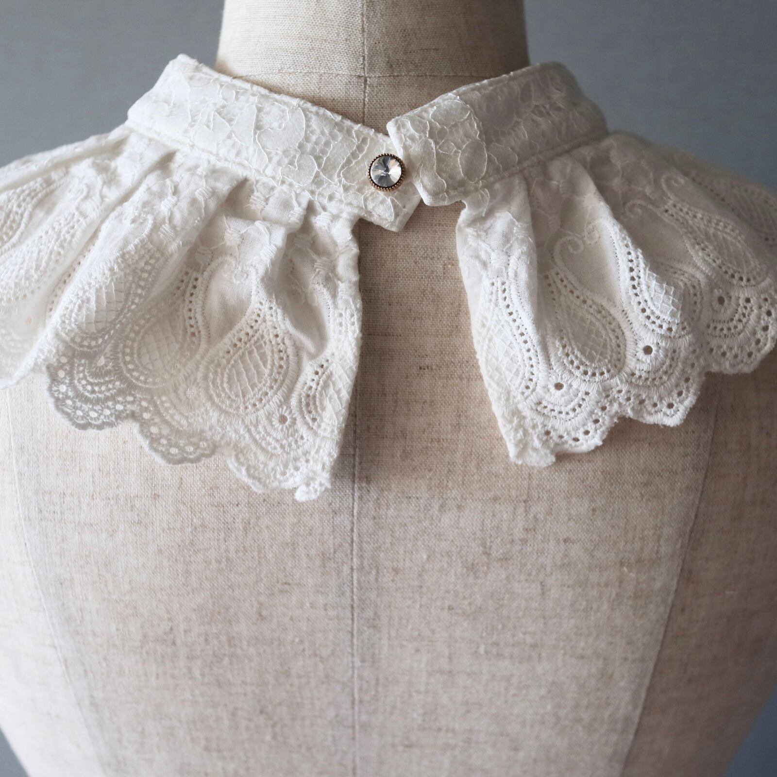 ビンテージレースを使用してハンドメイドで仕上げられたサイズ感がとっても可愛いつけ襟です。首も詰まりすぎておらず程よいゆとりがあり、大きいつけ襟は少し苦手…という方にも是非おススメの1枚です。