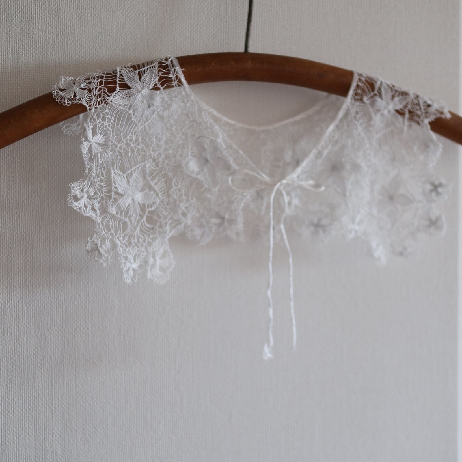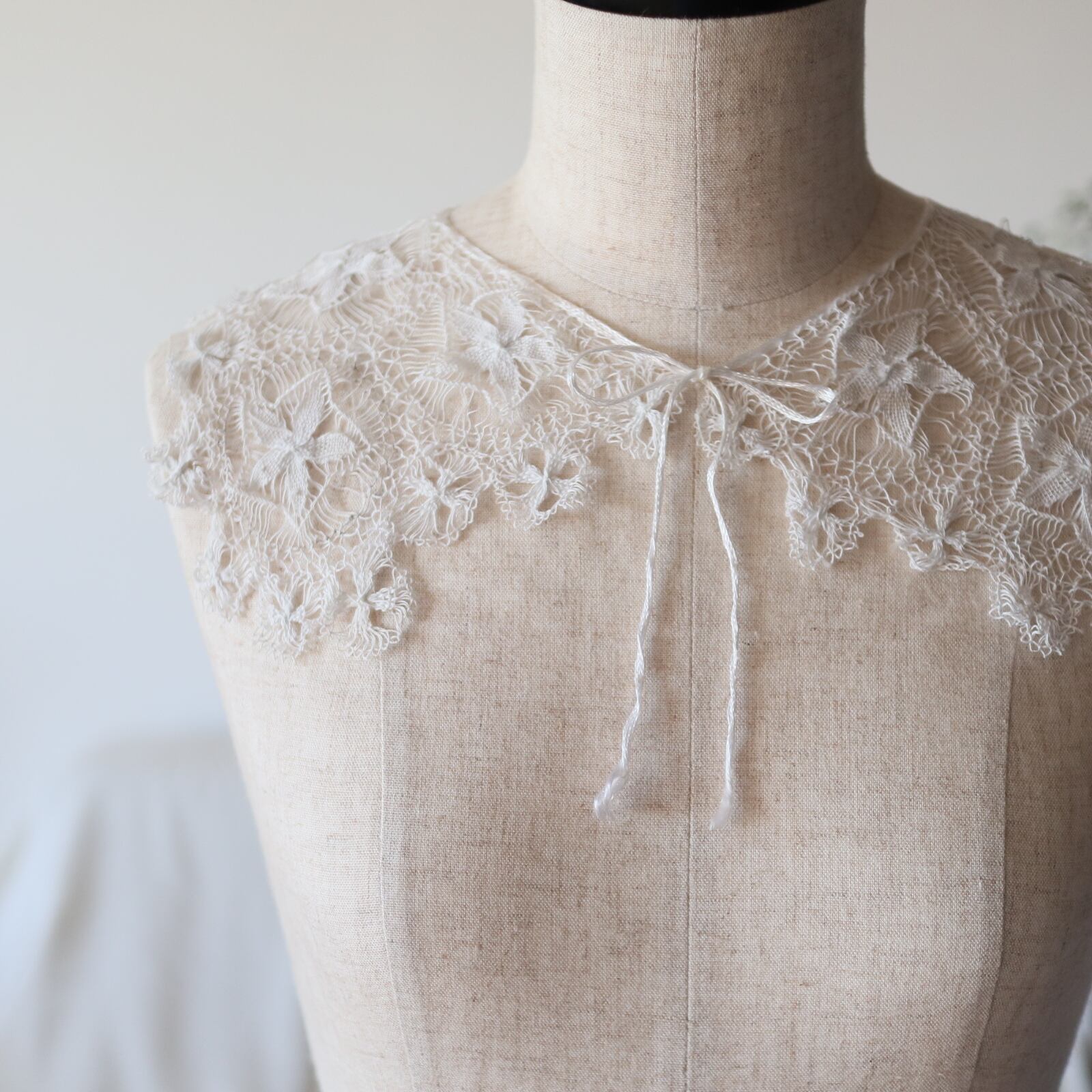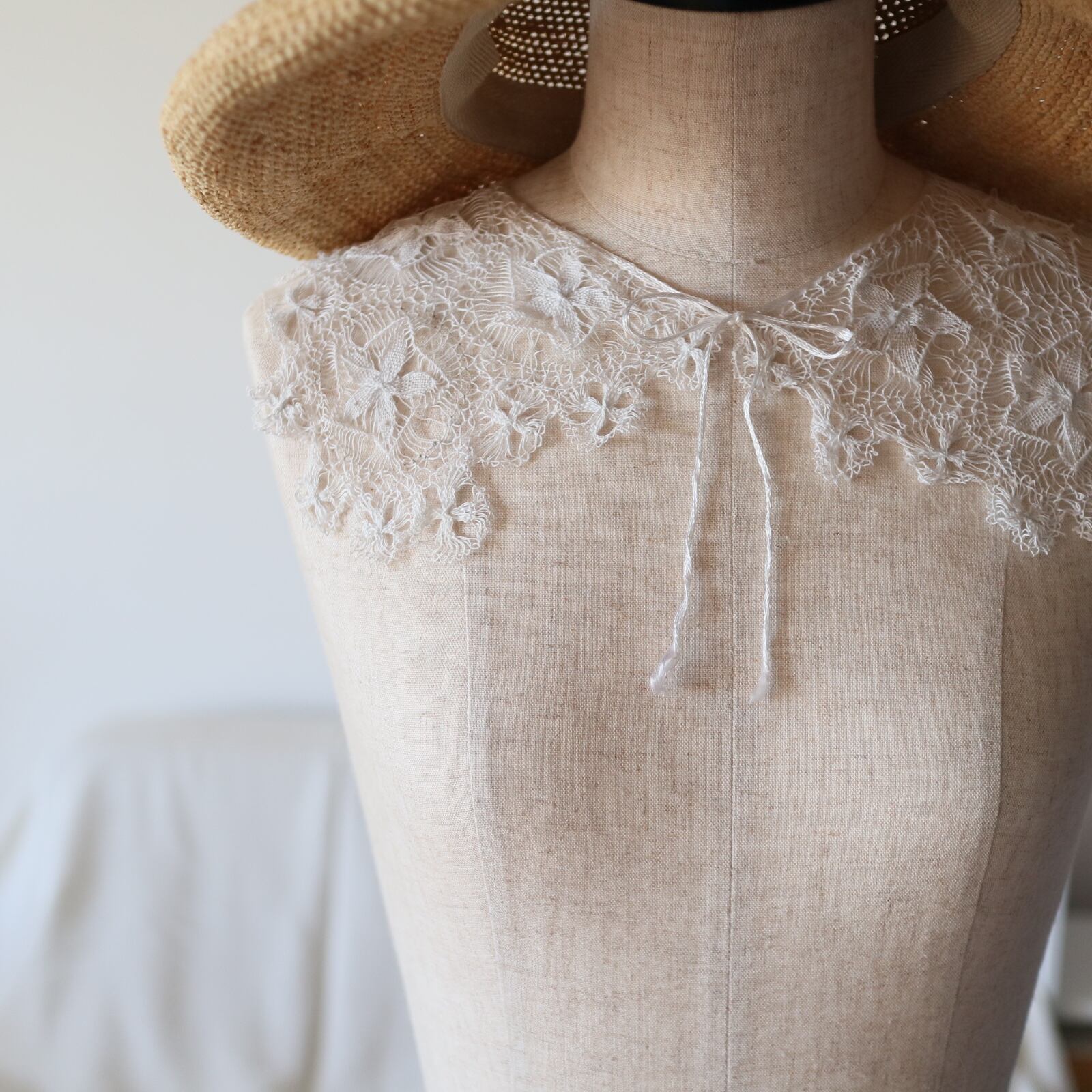 糸だけで編まれたニードルレースがとっても美しいヴィンテージレースカラーです。約100年前に編まれたこちらのつけ襟。繊細で控え目だけど…可愛らしい♡そんなつけ襟をお探しの方に是非おススメです。