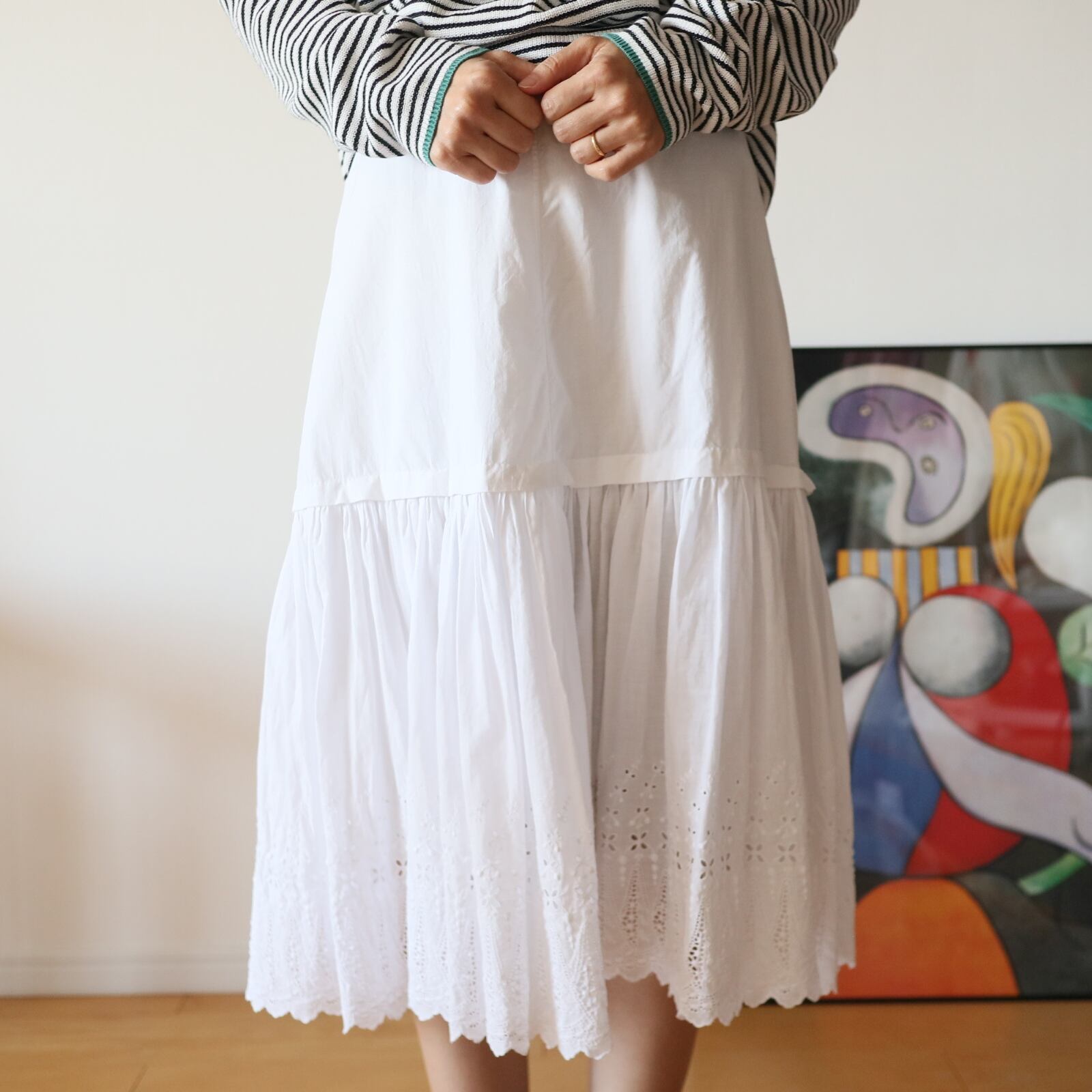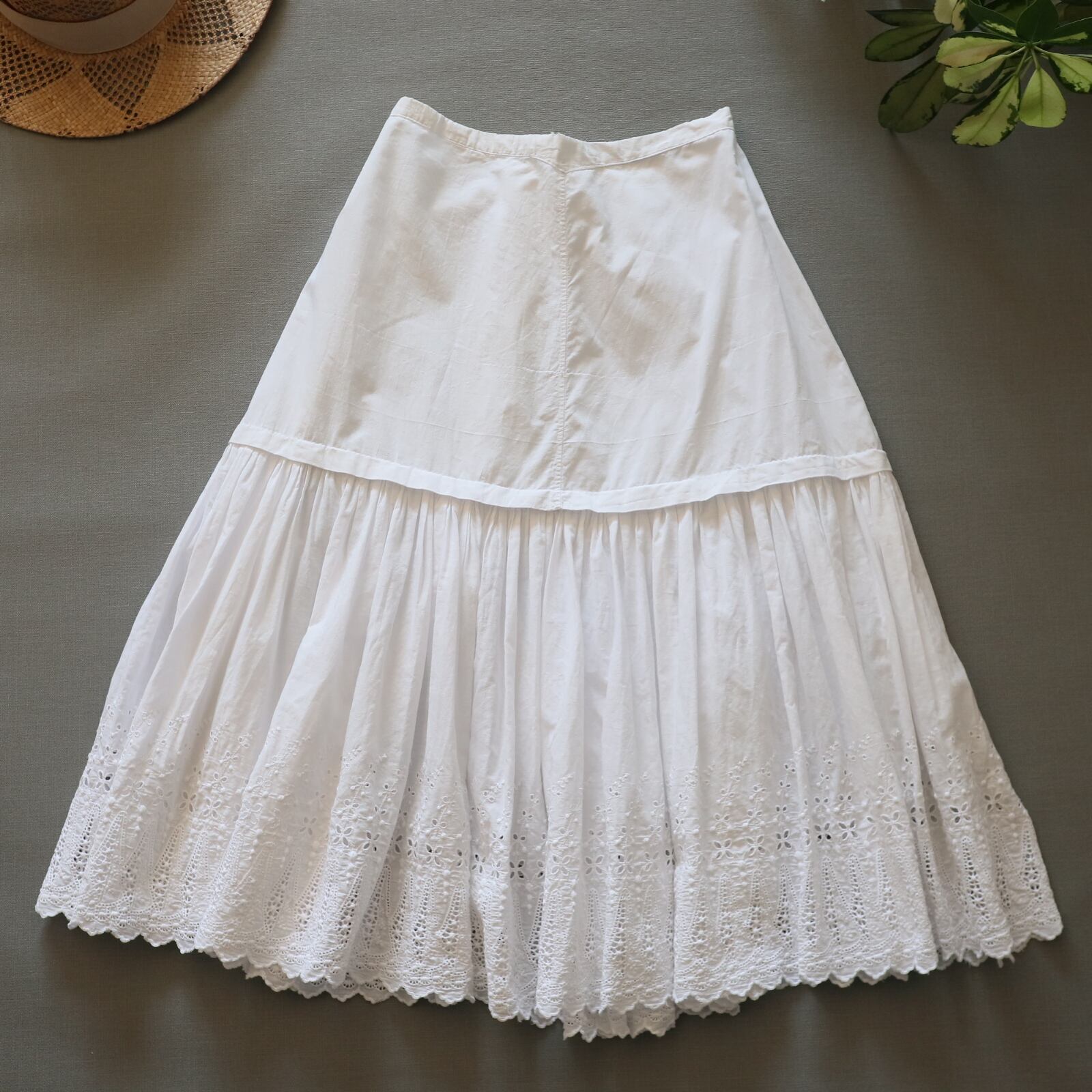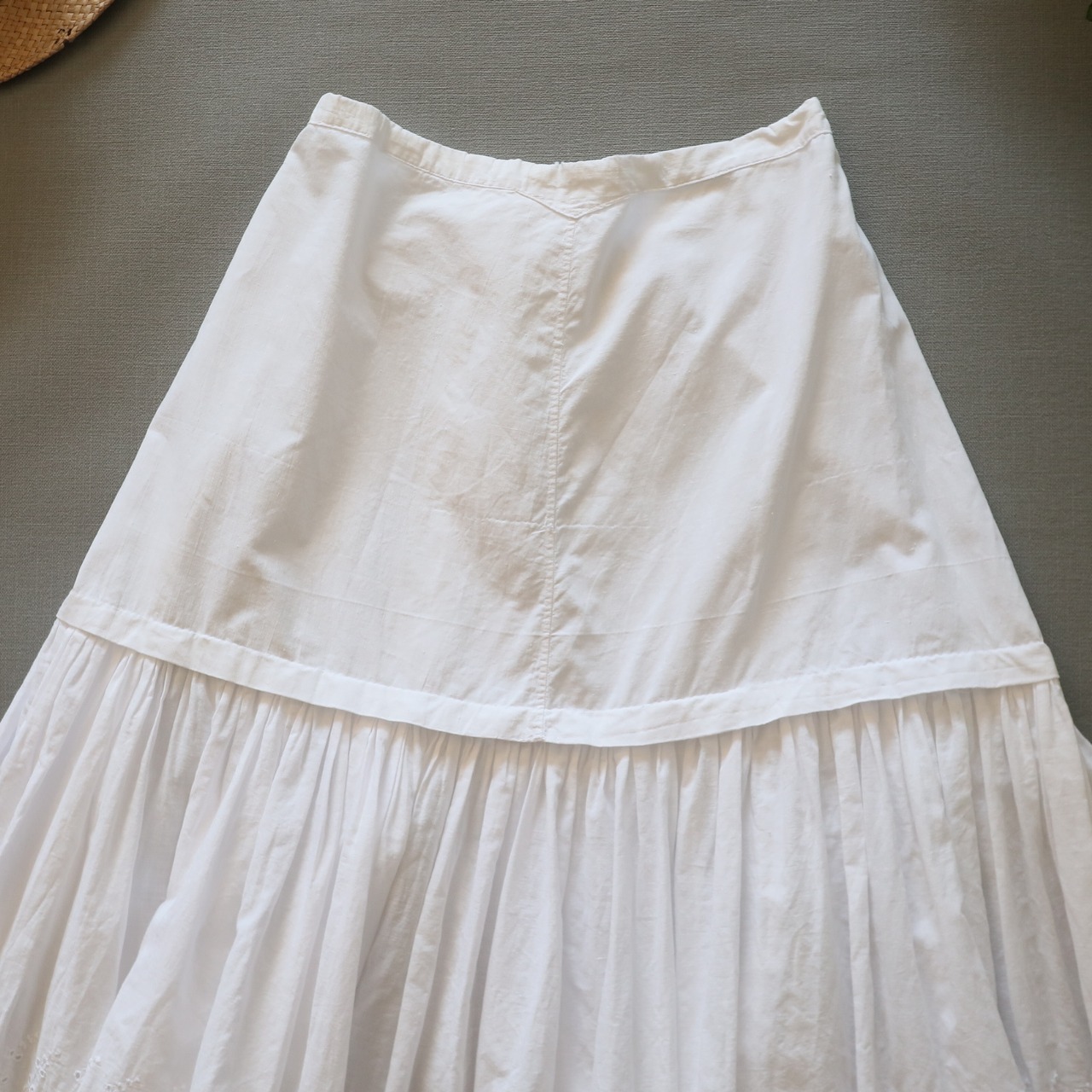 たっぷり使われたふわふわの生地がとっても可愛らしいアンティークペチコートです。ウエストはボタン仕様で2サイズ。身長の低い方や今年はミドル丈も挑戦したいという方に是非おススメの1枚です。