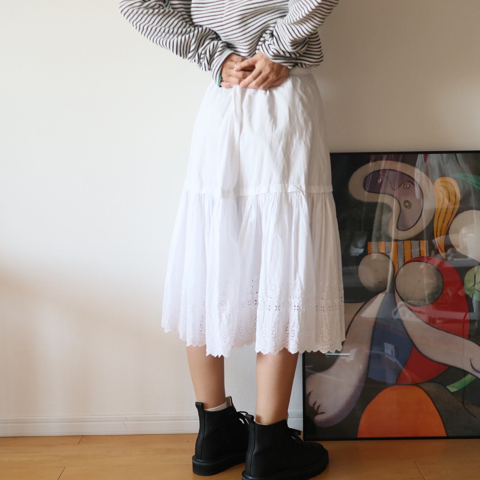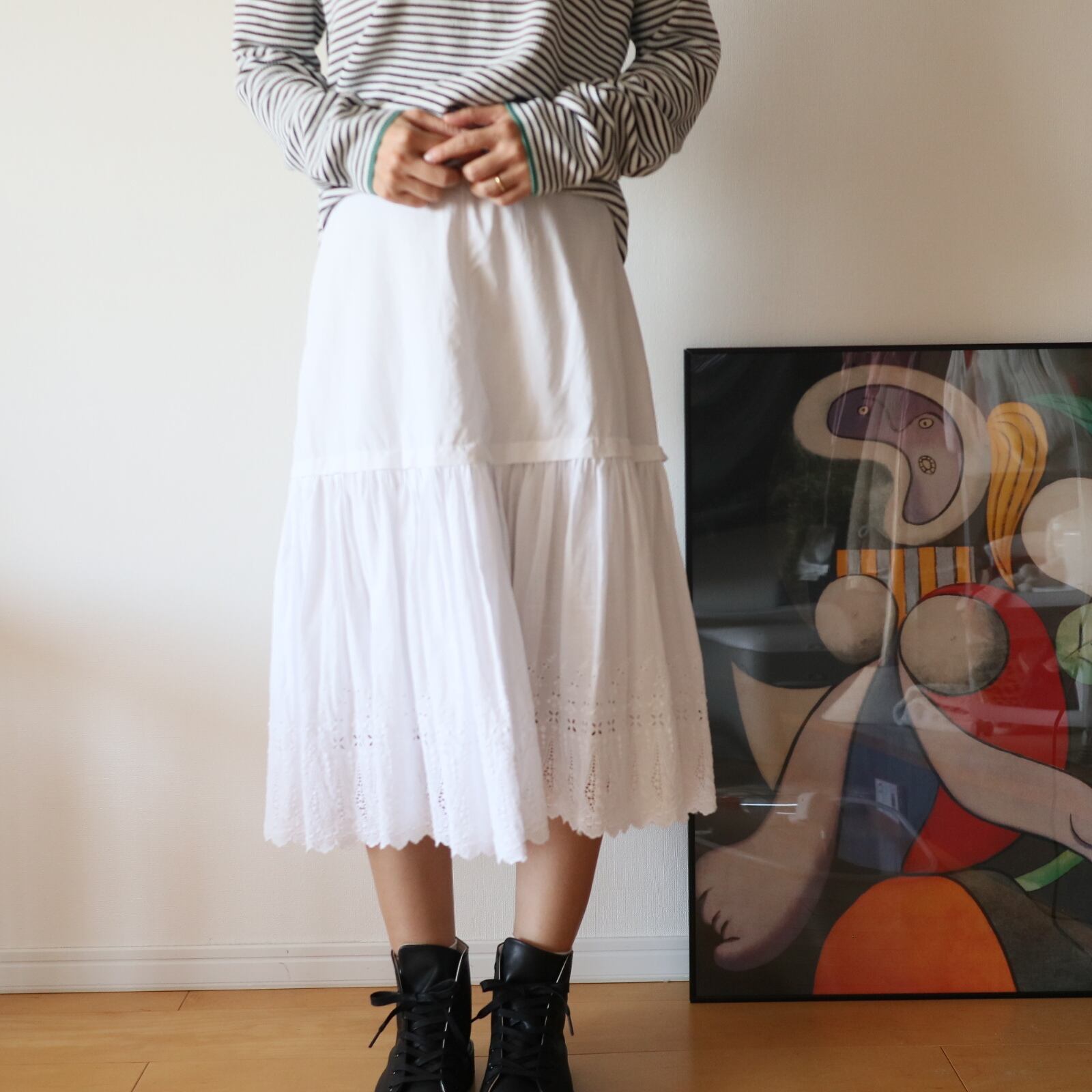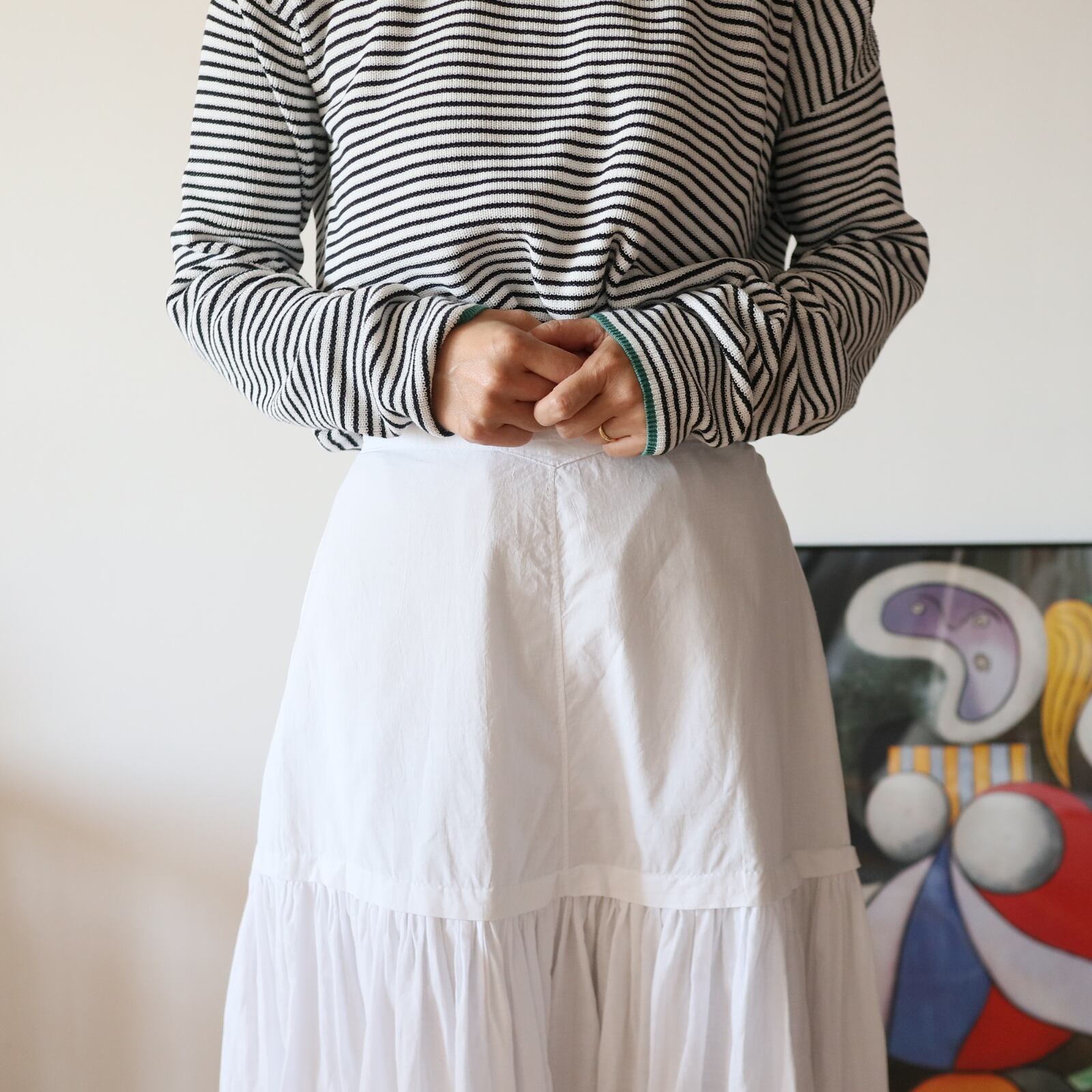 たっぷり使われたふわふわの生地がとっても可愛らしいアンティークペチコートです。ウエストはボタン仕様で2サイズ。身長の低い方や今年はミドル丈も挑戦したいという方に是非おススメの1枚です。