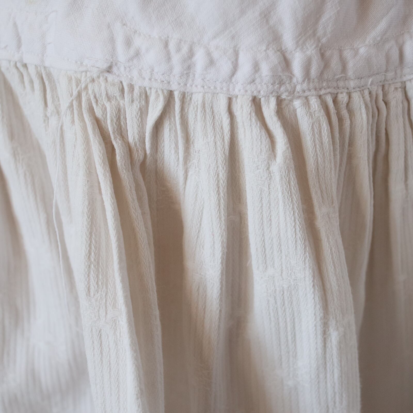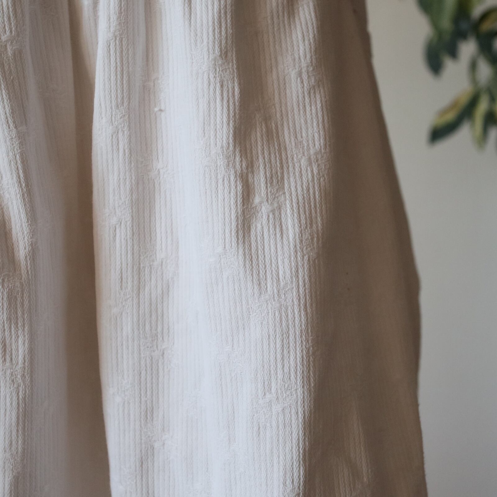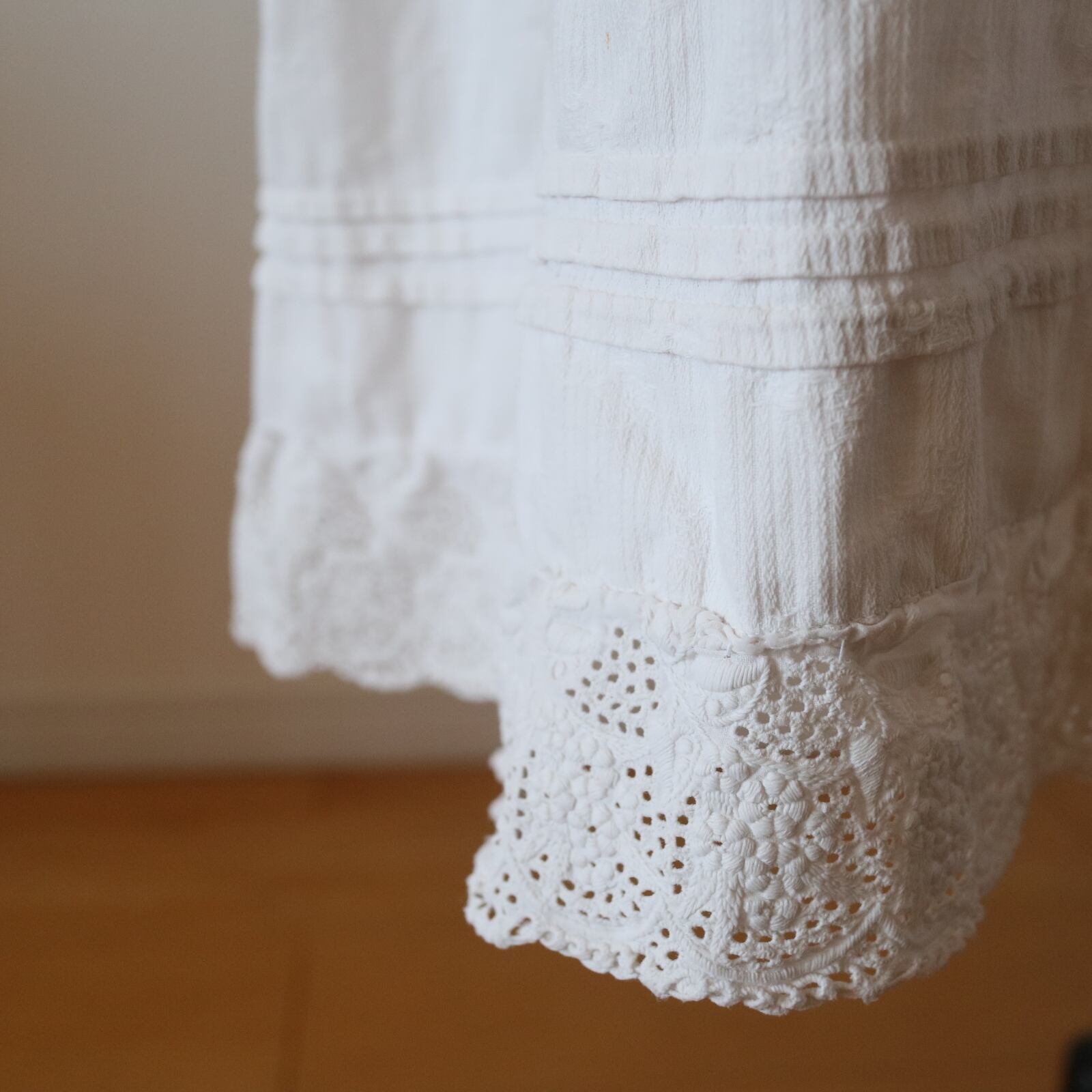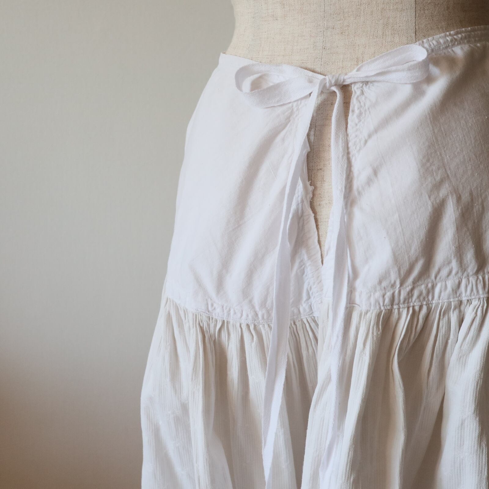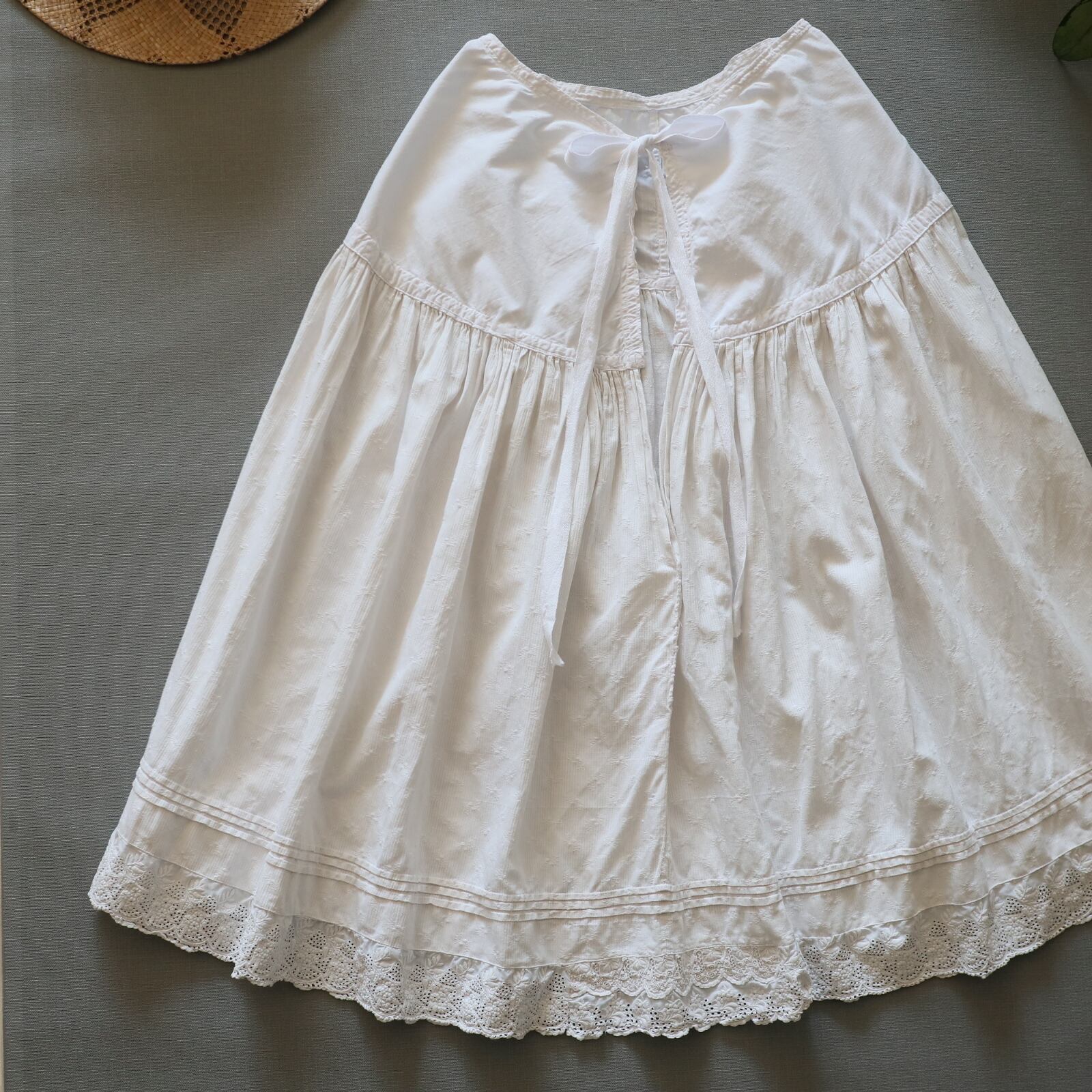 花柄の生地とウエストのリボンがとても可愛らしいアンティークペチコートです。後ろの開きが気になる方はボタンを付けても◎裾の透かし彫りのレースもとても可愛らしく、ワンピースにレイヤードしてもステキに着て頂けます♡ミドル丈をお探しの方にピッタリの1枚です。