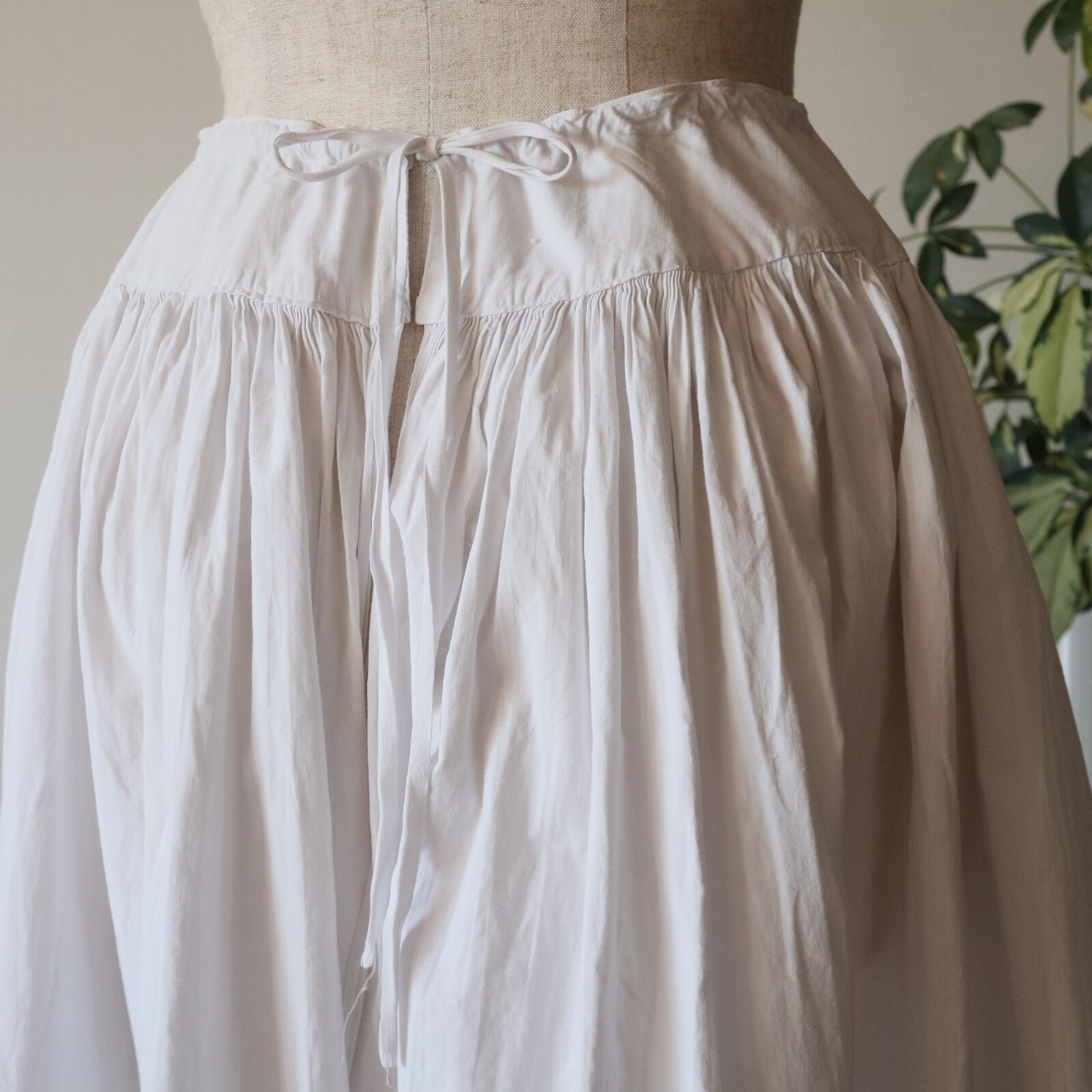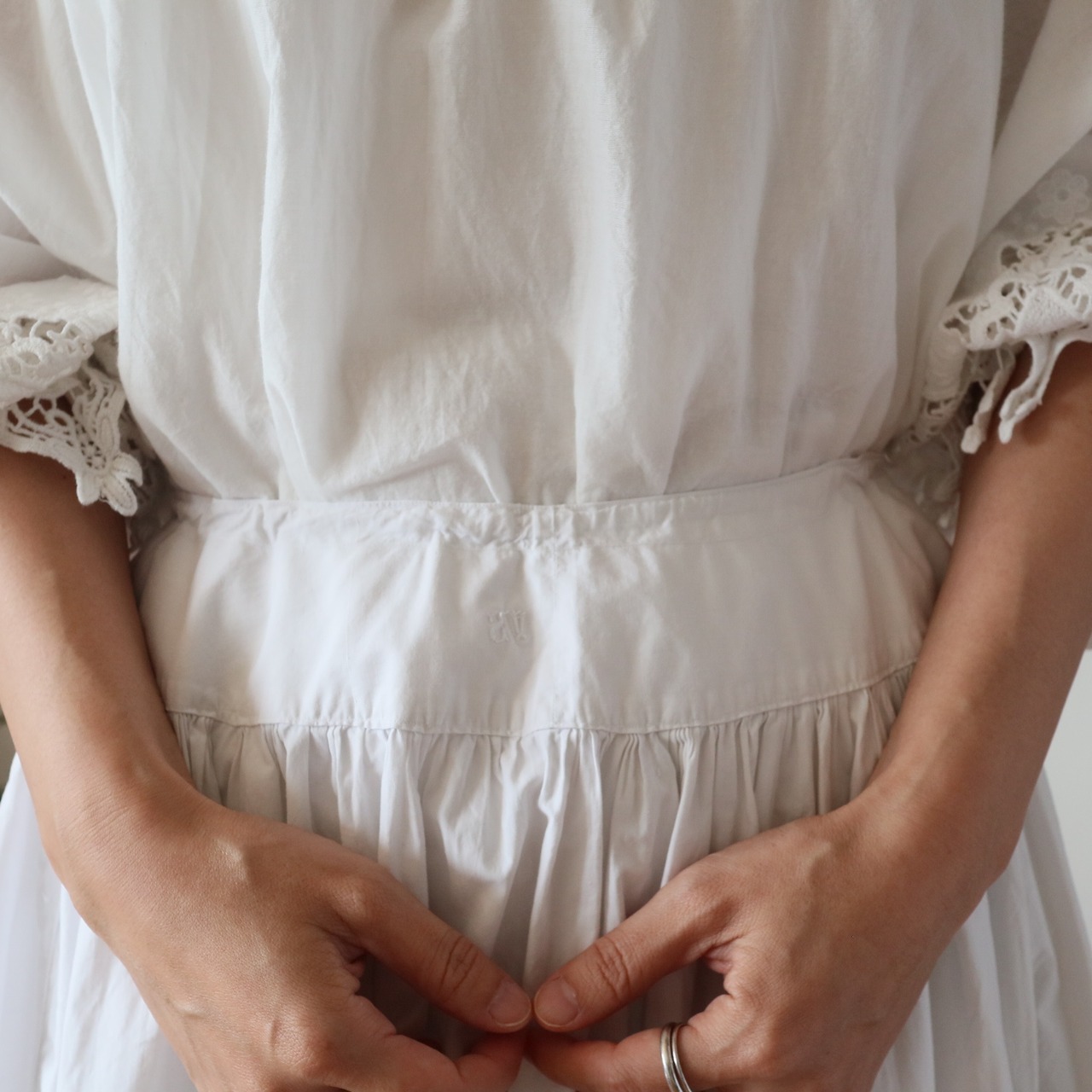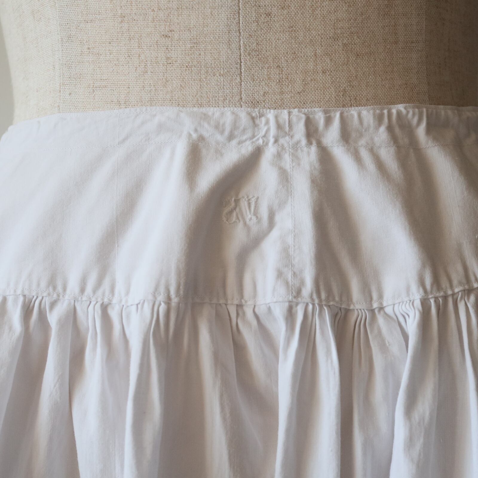 たっぷり使われている生地が何とも豪華なアンティークペチコートです。ウエストにはモノグラムのイニシャルが刺繍されており、その下には贅沢に沢山のギャザーが入っています♡タブリエの様な見た目も可愛らしく、店主が一目ぼれしたこの春イチオシの1枚です。