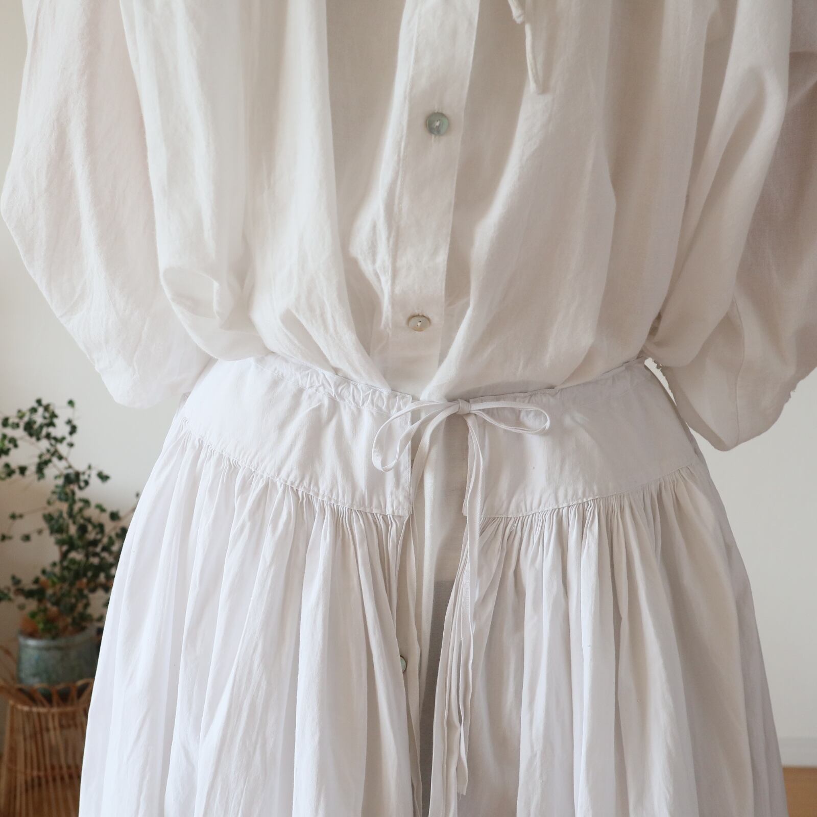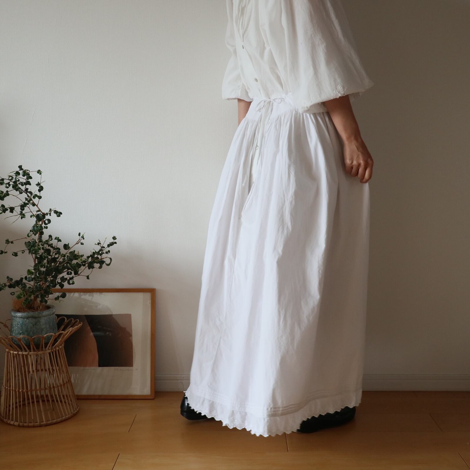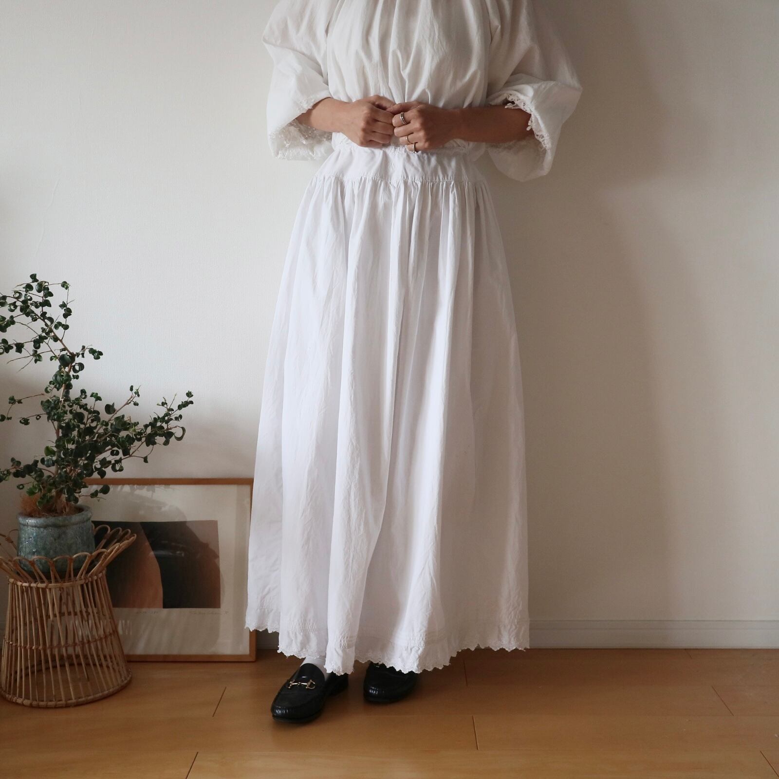 たっぷり使われている生地が何とも豪華なアンティークペチコートです。ウエストにはモノグラムのイニシャルが刺繍されており、その下には贅沢に沢山のギャザーが入っています♡タブリエの様な見た目も可愛らしく、店主が一目ぼれしたこの春イチオシの1枚です。