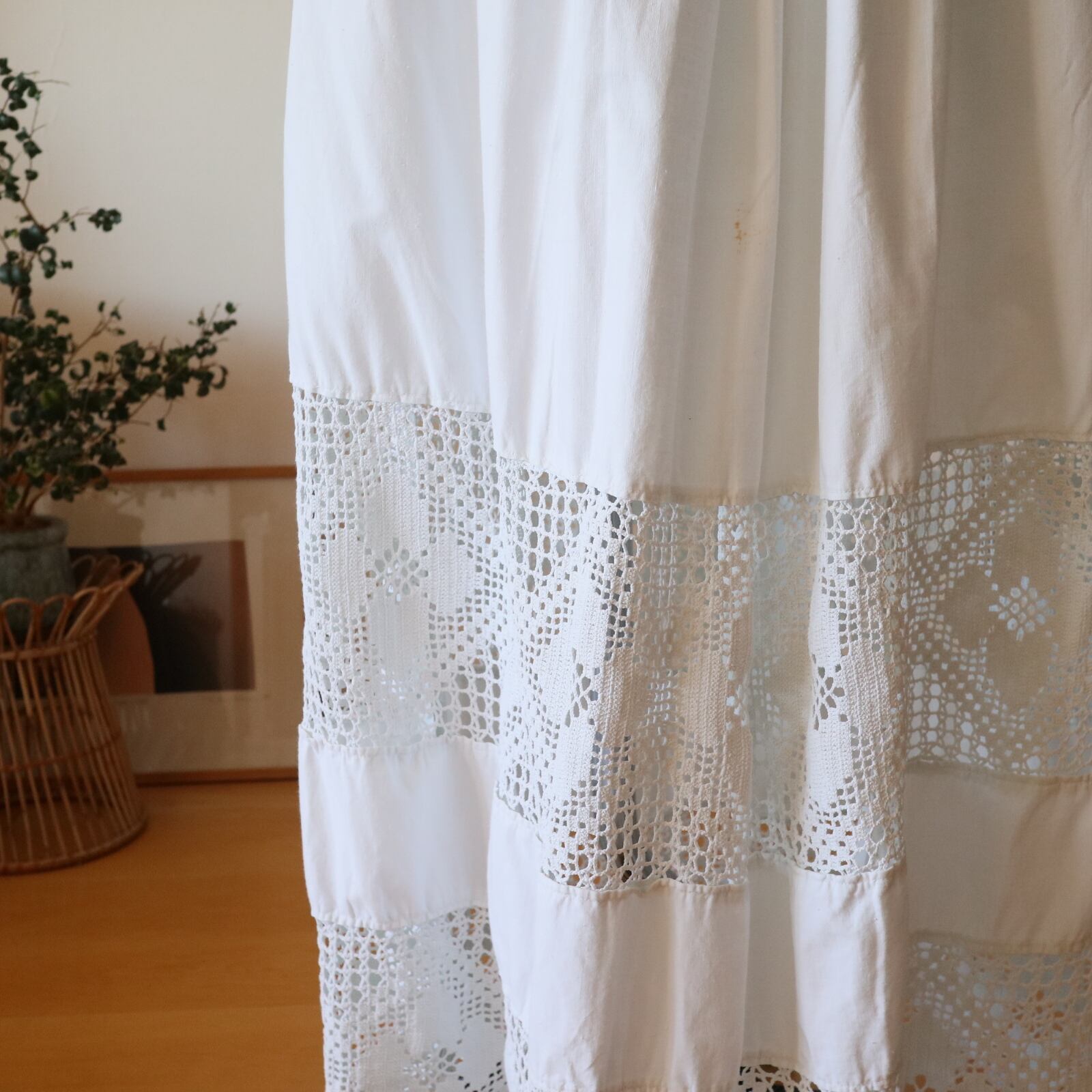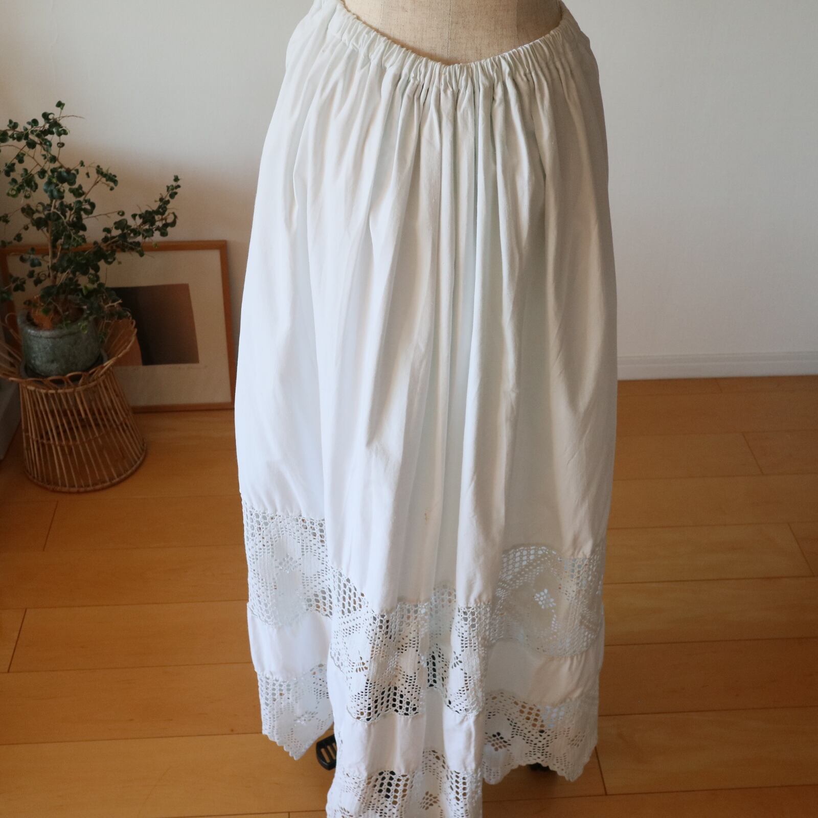 2段のかぎ針編みレースがなんとも美しいアンティークペチコートです。ウエストがゴム仕様なので着脱しやすく、ウエスト全体に生地が寄っているところも可愛いpoint。丈が長めですがウエスト部分で丈詰めすればどなたでも着て頂けます。少し青みがかったホワイトcottonが大人っぽくとても美しい1枚です。