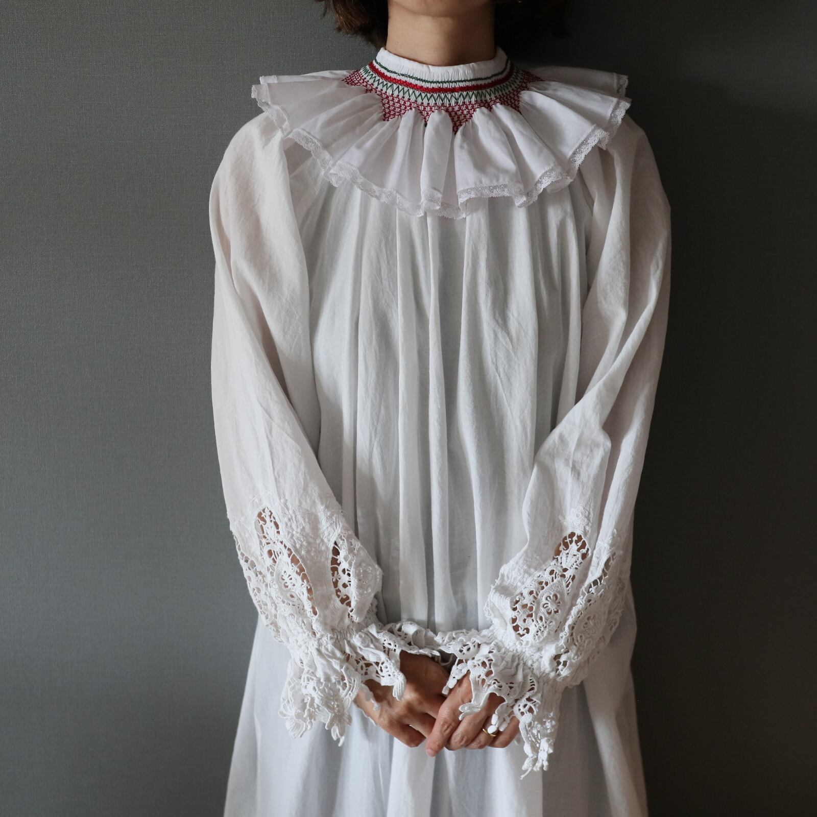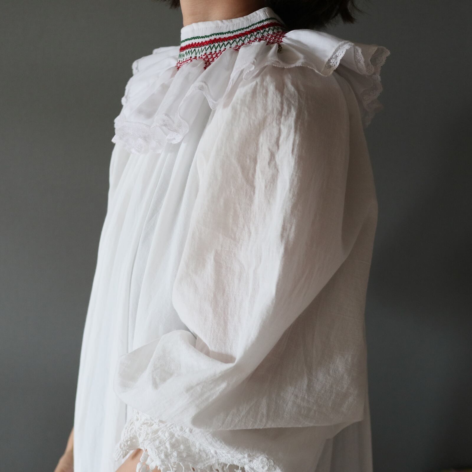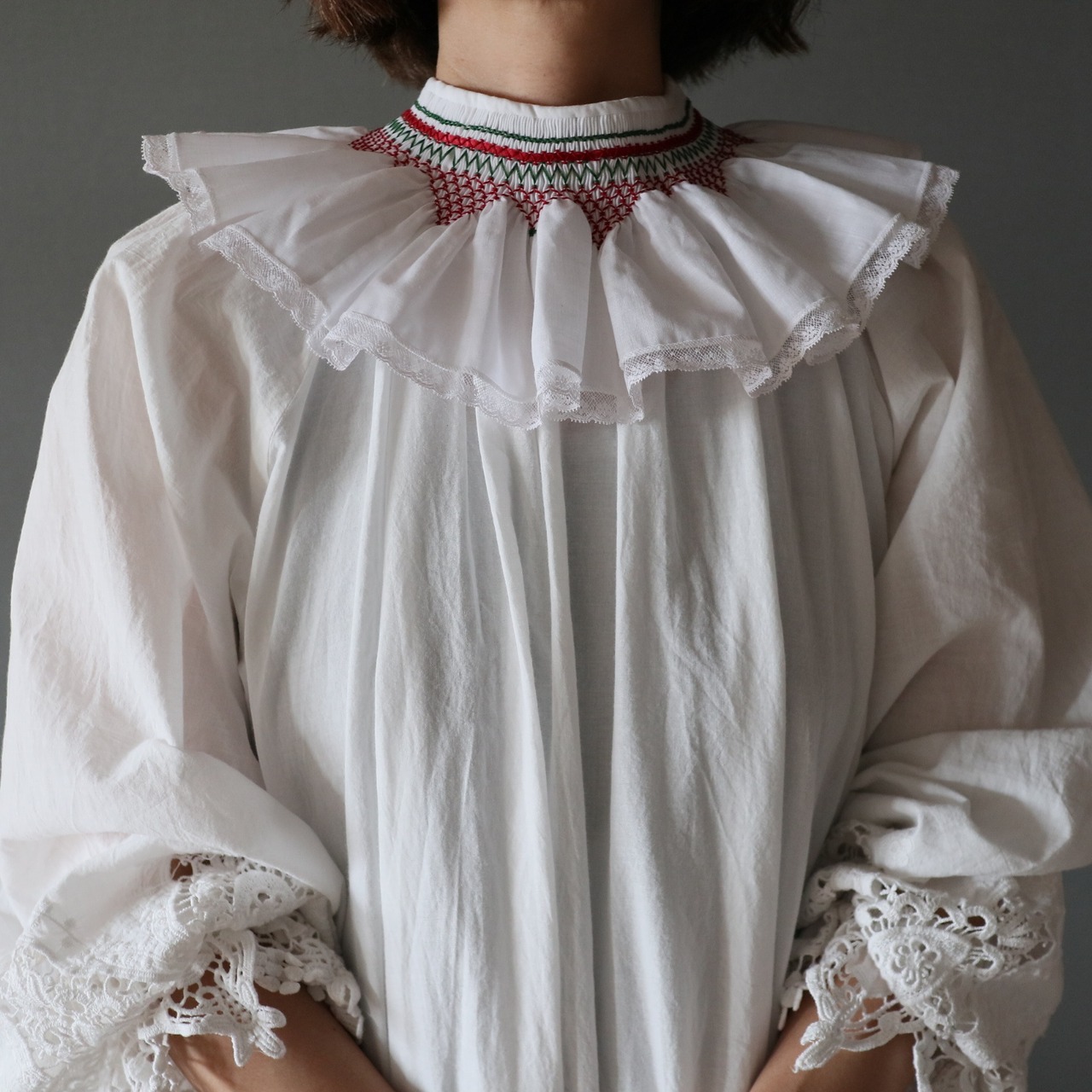 色合いがなんとも可愛らしいヴィンテージカラーです。ひそかに付いている6つの小さな鈴がpoint!アンティークウクライナワンピースを彷彿とさせるデザインが、1枚でコーデの主役になります♡東欧好きの方にもおススメの中々手に入らないとっても珍しいヴィンテージつけ襟です。